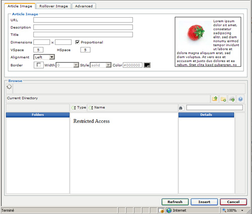 Je précise que le problème "Restricted Access" est survenu après la mise à jour de JCE 1.1 En effet, pour une raison inconnue la version précédente de JCE s'était mise subitement à placer des blocs d'image dont le lien était rompu lors du premier placement. Il fallait réitérer chaque placement d'image une seconde fois pour que cela fonctionne. Déjà un problème de cache ?)