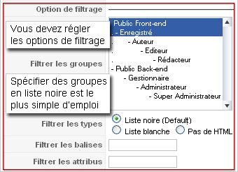 Option de filtrage : la liste des options de filtrage permet de gérer les actions autorisées. Attention, si vous n'appliquez aucune valeur, l'utilisation de certaines extensions comme les éditeurs évolués vous poseront des problèmes.