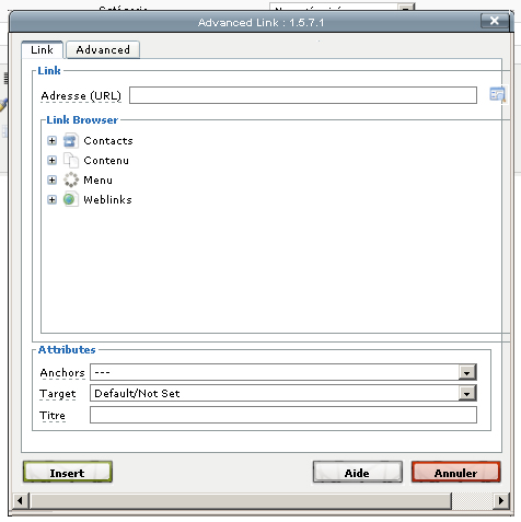 J'avais installé JCE depuis quelques temps et il fonctionnait très bien. Cependant, je viens de me rendre compte que la gestion des liens ne fonctionne plus du tout. J'ai installé quelques modules entre temps mais je ne vois pas pourquoi Advanced link ne fonctionne plus.