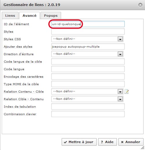 • J'ai édité un article et ajouté un lien dans l'article et dans l'onglet popup de la boîte lien, j'ai bien sélectionné "chaque fois" pour le paramètre "popup automatique".