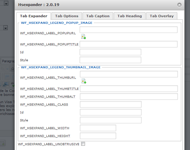 Voila, j'ai découvert l'extension Highslide, mais j'ai un petit soucis avec l'éditeur JCE 2. Toute l'installation se passe bien, j'active tous les trucs à activer, j'installe HSexpander pour avoir ma petit icône dans l'éditeur, je glisse l’icône et tout marche. Le problème vient du fait que lorsque je clique sur l’icône de l'éditeur pour rajouter une galerie à un de mes articles, tout le descriptif est illisible (voici un screenshot pour illustrer mes dires). J'ai déjà ré-installer tous les composants sans succès. J'ai aussi installer le HSexpander 2.0.20 disponible sur le site anglophone, mais j'ai le même problème.