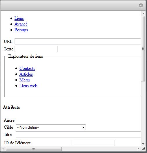 Pour le fond ca fonctionne, mais je m'apercois qu.il me manques des boutons. Nottemment la création de lien hypertyexte. Il y a le lien pour briser un lien mais pas pour le créér. et avec le clic droir l'option n'est pas la non plus.