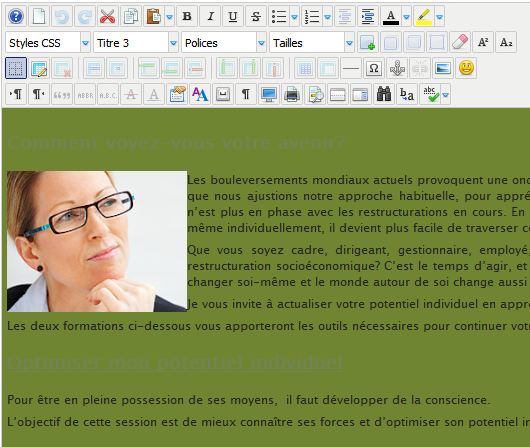 La nouvelle installation par dessus c'est bien déroullé, pas de message d'erreur par contre losque j'édite un article, le fond est tout vert au lieu d'être blanc et comme j'utilise le vert dans mes titres je ne vois plus rien ?