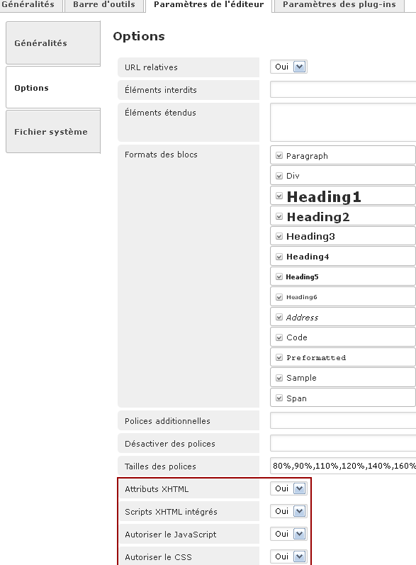 2. l'autorisation d'insertion de XML, Javascript et CSS comme dans l'image jointe