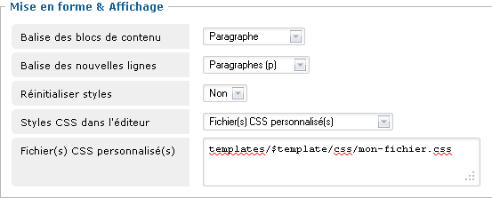 et bien sûr j'ai respecté les valeurs que vous fournissez dans "Mise en forme & Affichage" en remplaçant mon-fichier.css par math.css (templates/$template/css/math.css)