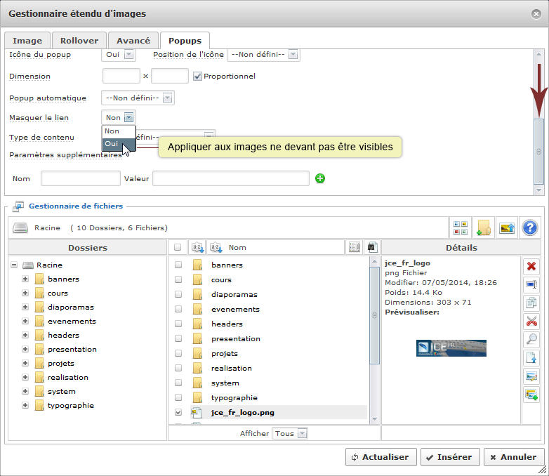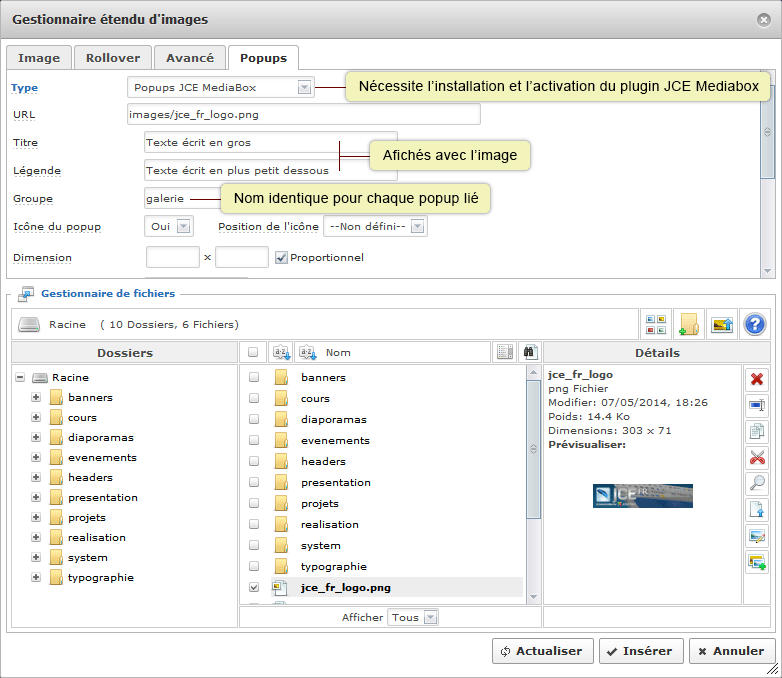 JCE propose un lot de plugins sous abonnement dont l'un est le gestionnaire étendu d'images.