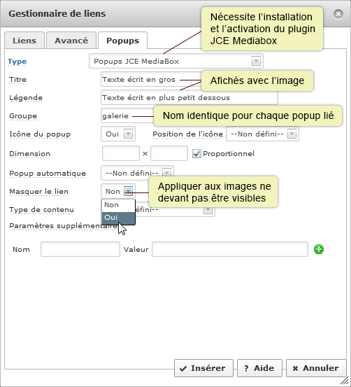 Il est possible de lier des images qui s'ouvrent en popup en donnant un nom de groupe identique dans les paramètres du lien, onglet Popup.