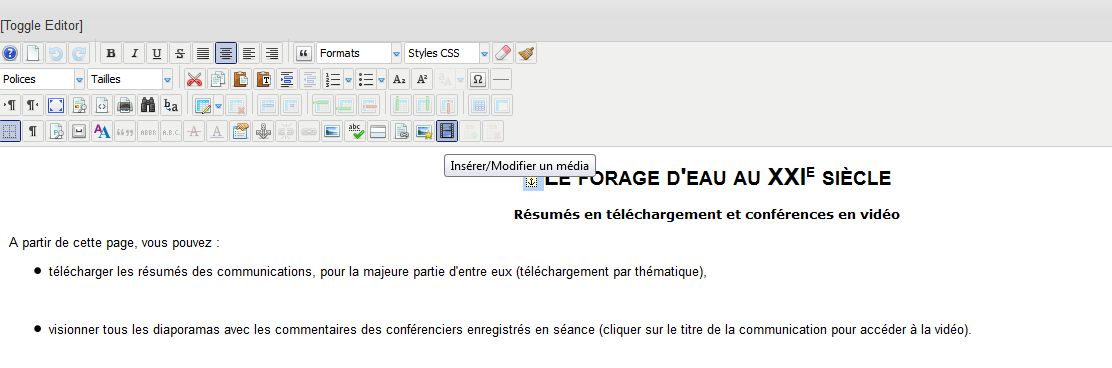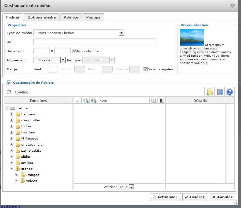 Bonjour, merci de cette réponse. j'ai activé le javascript qui ne l'étais pas. Je n'utilise pas media manager, mais le bouton dédié insérer/modifier un media cf copie d'écran puis je sélectionne flash video. mais toujours rien à l'écran.
