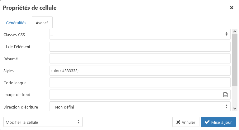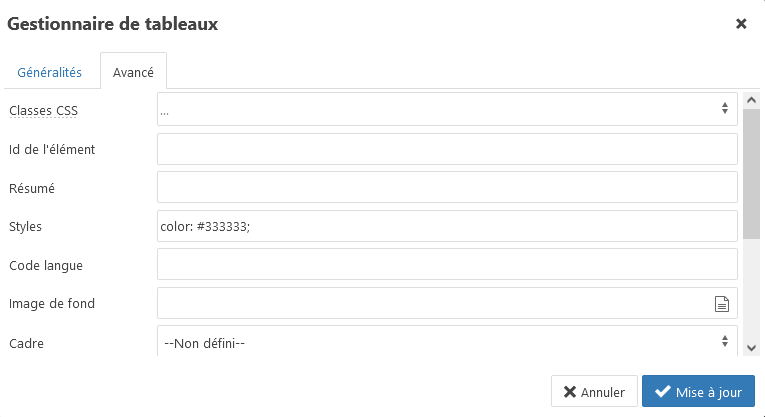 Pour la couleur de l'ensemble des textes du tableau c'est le même principe, s'il n'y a pas de couleur appliquée au texte des cellules ou au texte lui-même, tu peux définir cette valeur au tableau dans l'onglet "Avancé" et le champ "Styles" (color: #333333 par exemple).